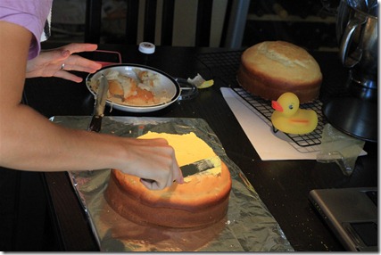 I started by baking two big circle cakes along with a half dozen cupcakes. While those puppies were cooling off I started in with the key element to a super cute duck… it’s beak! (and maybe some feet).